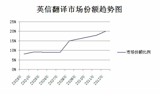 (4) 市场份额趋势; 根据国家统计局的相关数据,截止到2008年,中国的翻译市场份额以及超过了两百亿元。从如下数据可以看出,自2003年以来,过去十年我们在整个行业中的市场份额不断提高,目前已经超过20%。换言之:每5个客户,就有一个选择英信翻译公司。